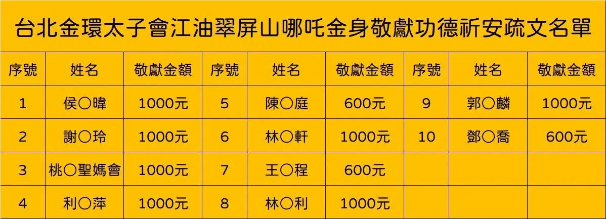 乙巳年敬獻翠屏山哪吒三太子金身消災祈福名單