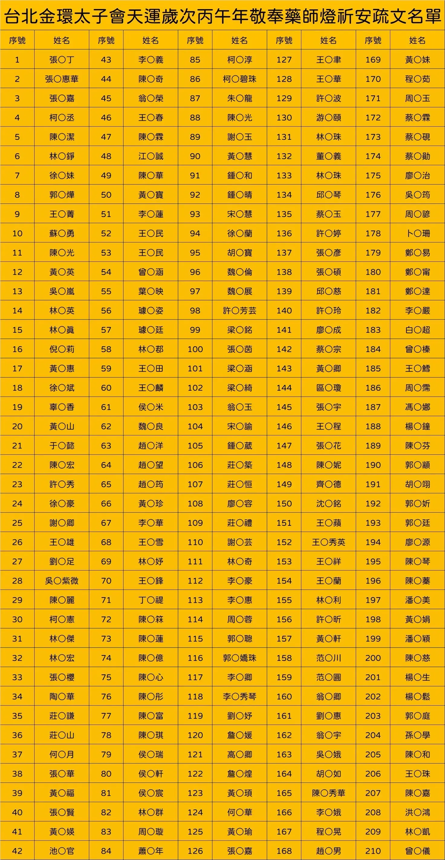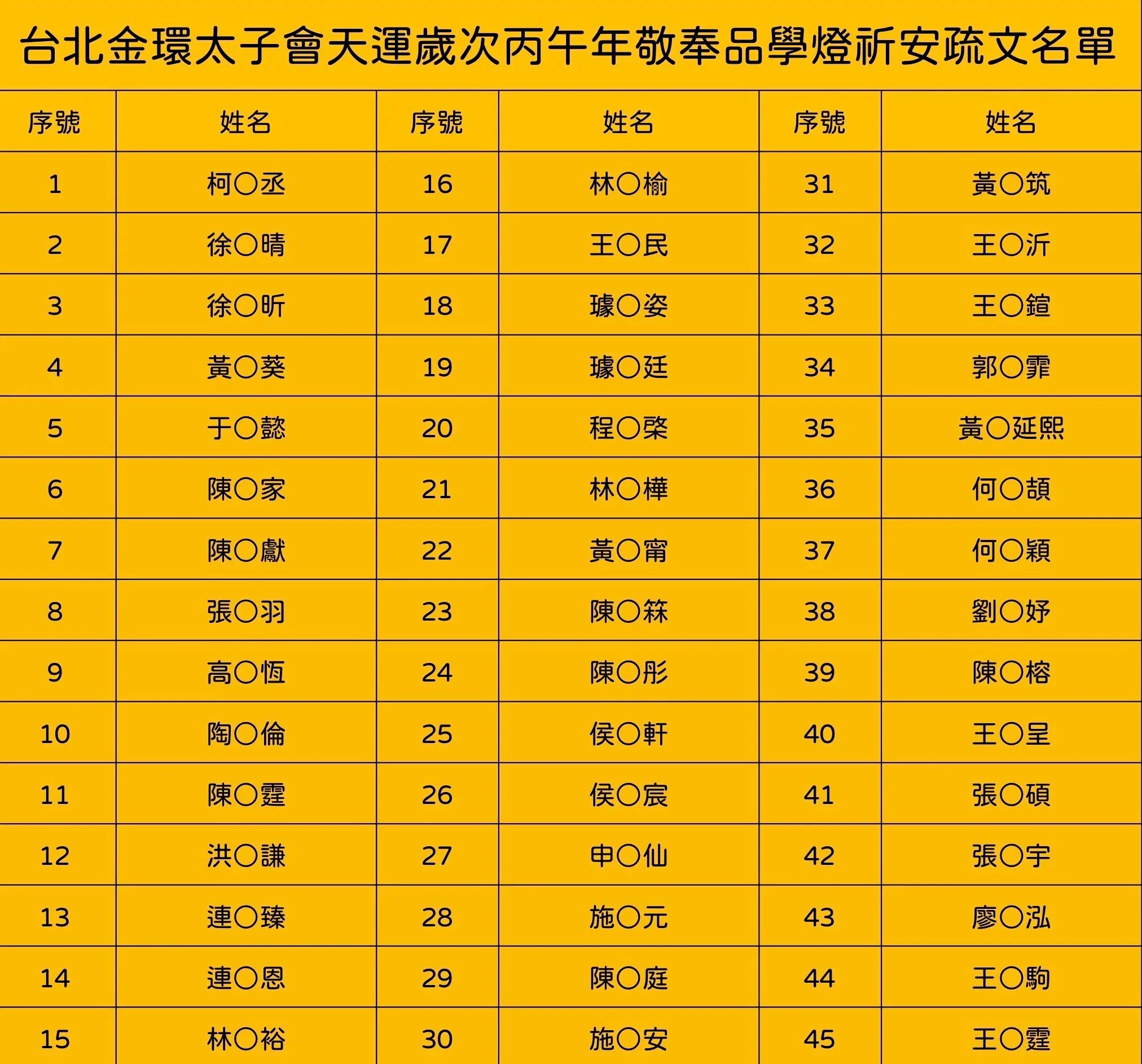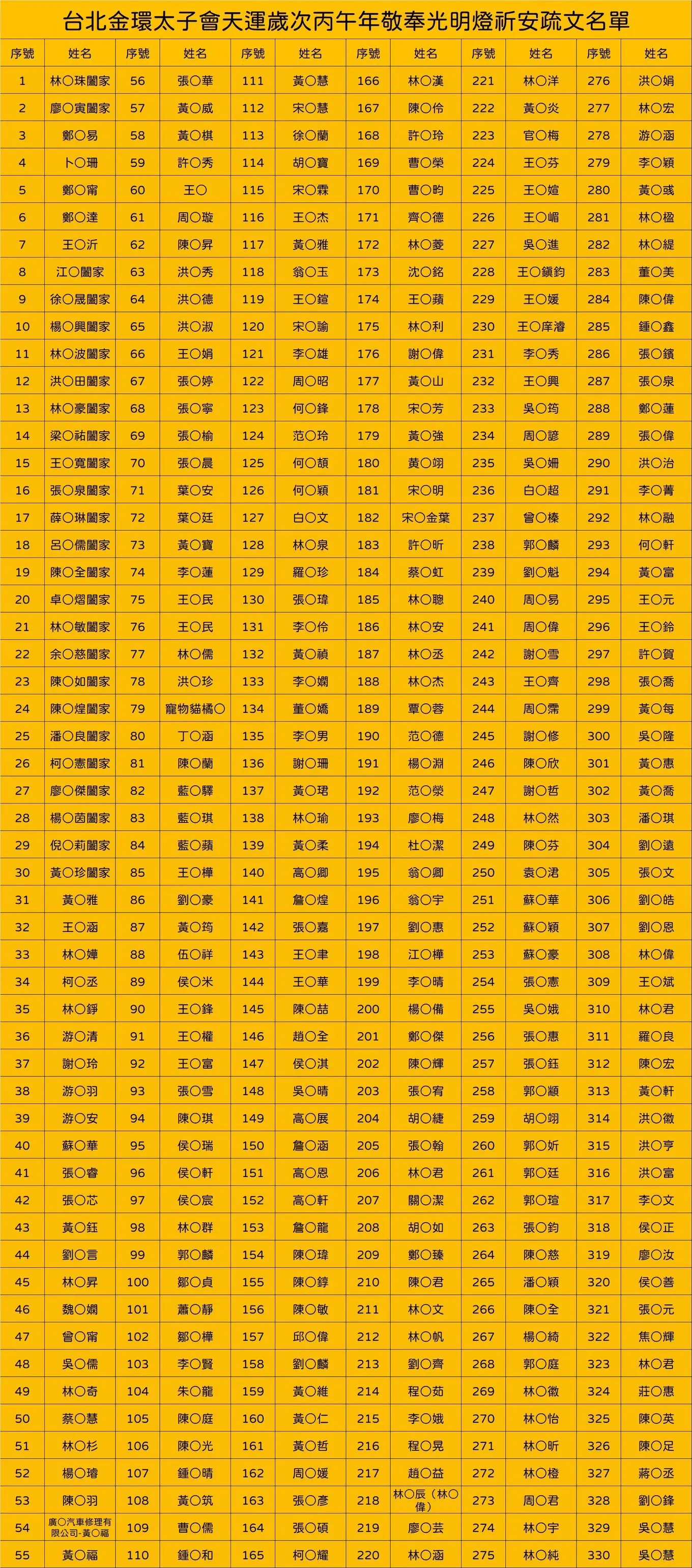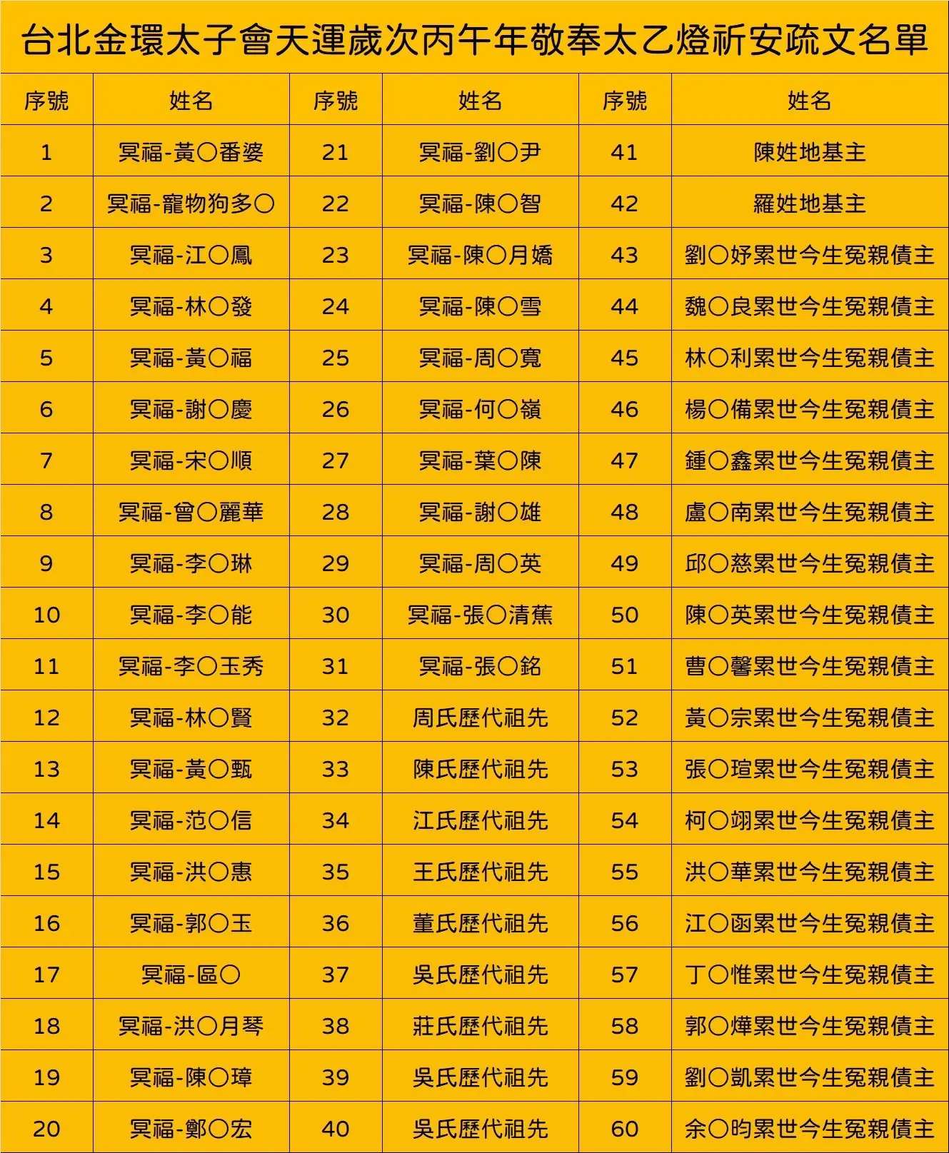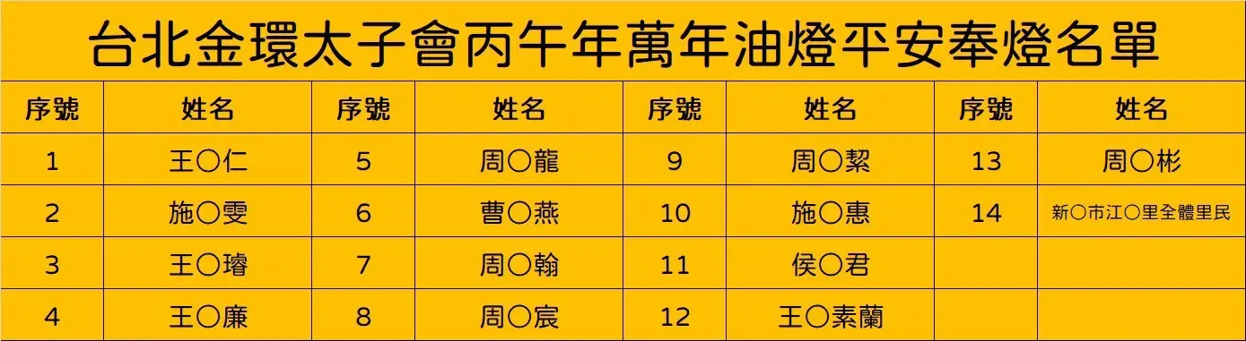 丙午年正月十五日安奉光明燈、安奉太歲祈安植福名單